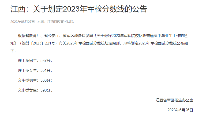 根据军队院校招收普通高中毕业生工作的有关文件精神,依据考生志愿和上线人数,区分历史类、物理类和男生、女生,划定了体检面试控制分数线,具体如下: