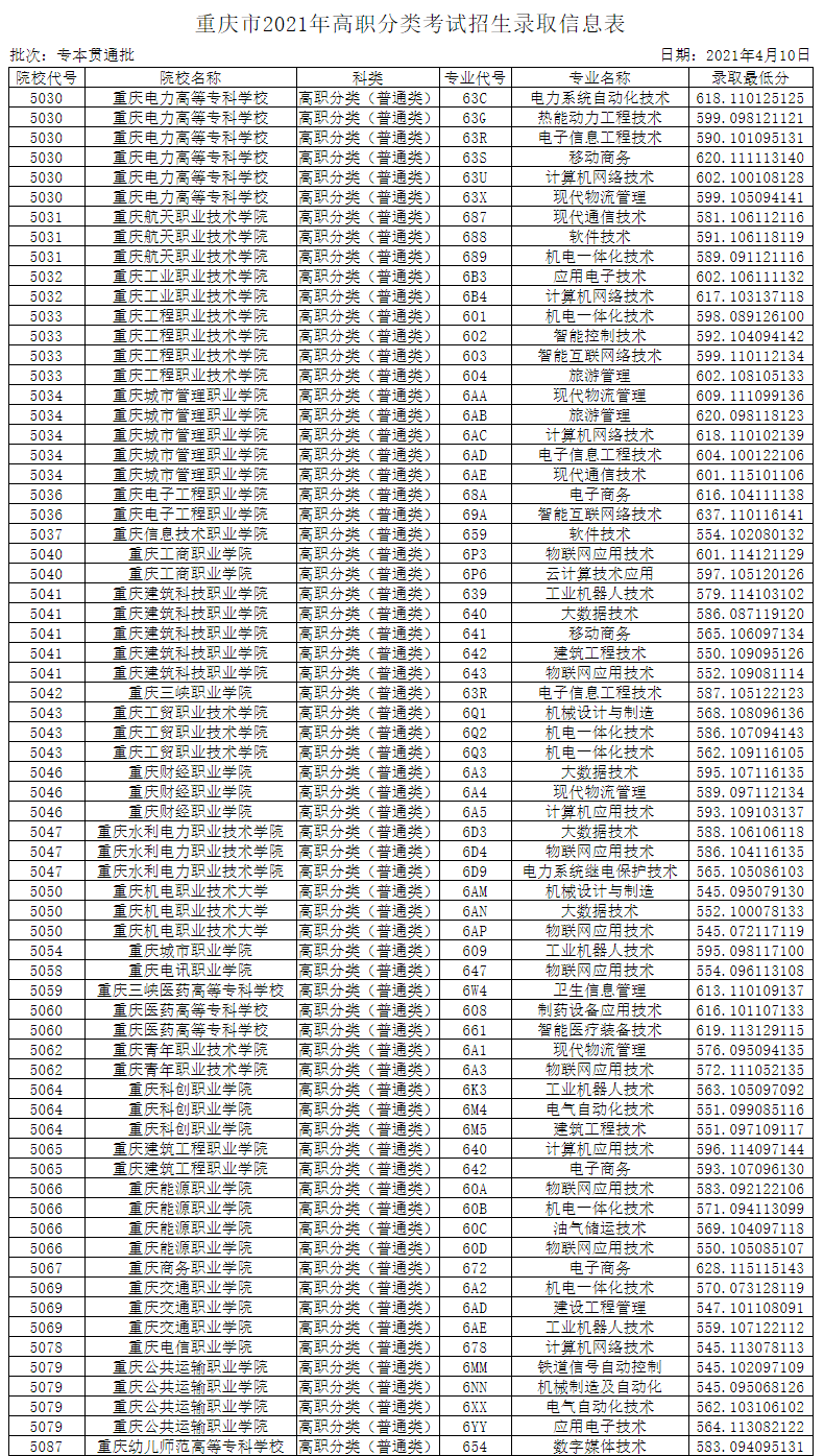 重庆市2021年高职分类考试招生录取信息表-高职分类专科批(普高类)
