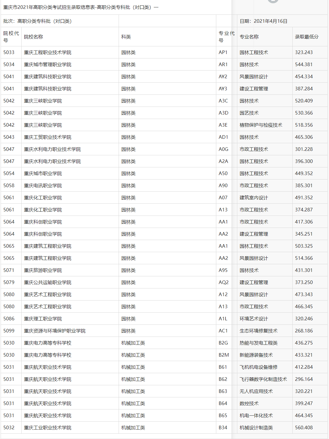 重庆市2021年高职分类考试招生录取信息表-高职分类专科批(对口类)