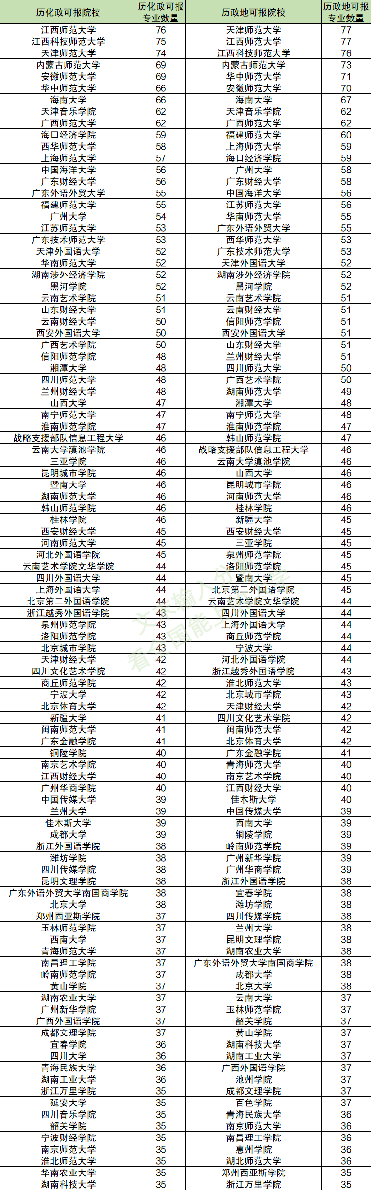 如海口经济学院历化政可报59个专业,历政地能报59个专业;广东财经大学历化政可报56个专业,历政地可报58个专业;福建师范大学历化政可55个专业,历政地可报60个专业等。