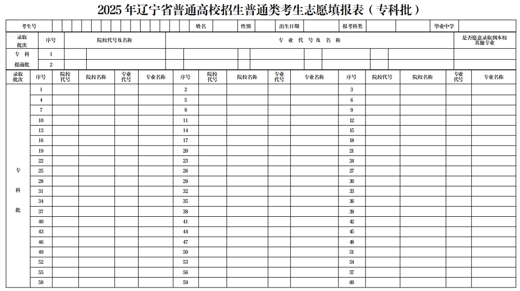 辽宁新高考志愿填报样表分为5列,包括志愿号、院校代号、院校名称、专业代号和专业名称。辽宁普通类本科批填报112个志愿,冲稳保比例安排可以是40:33:39,也可以是11:62:39,考生可根据自身情况选择合适的方案。