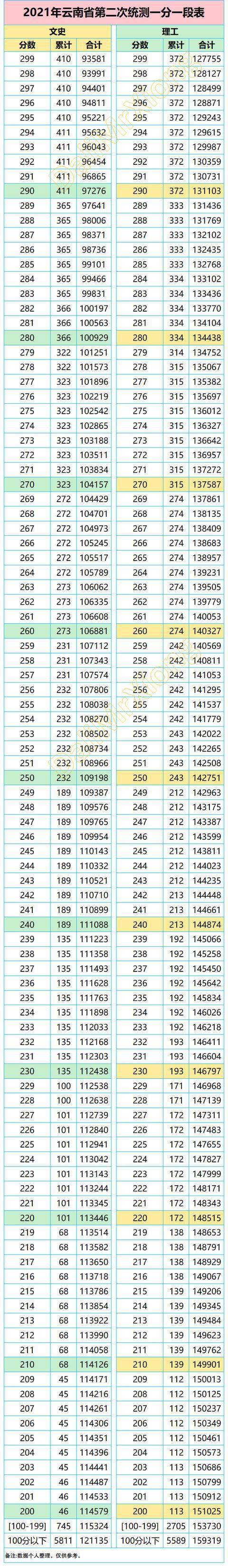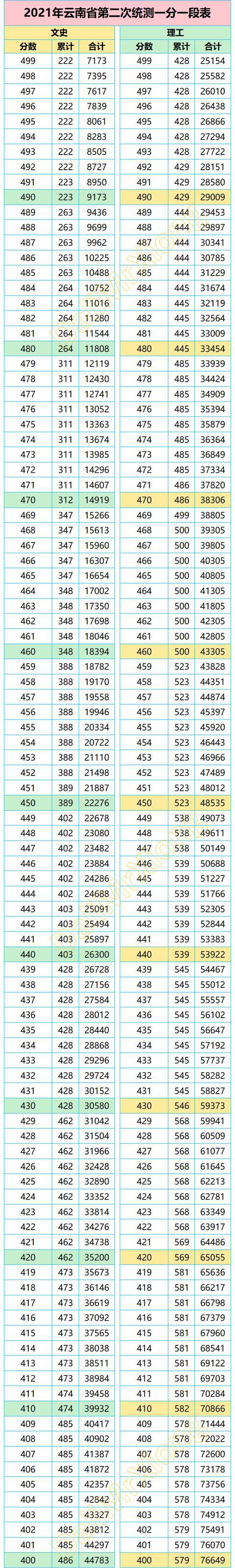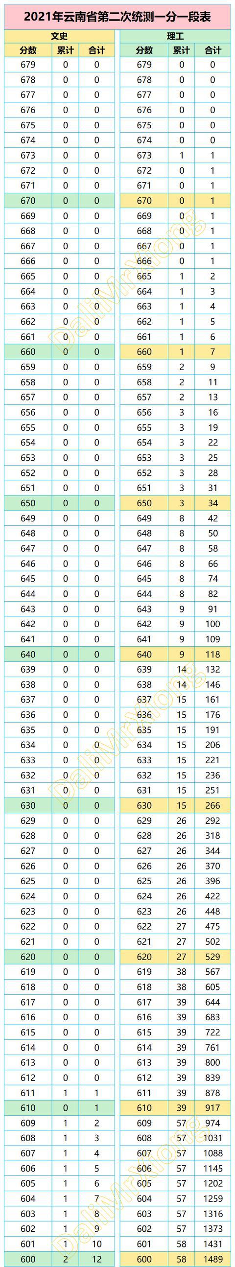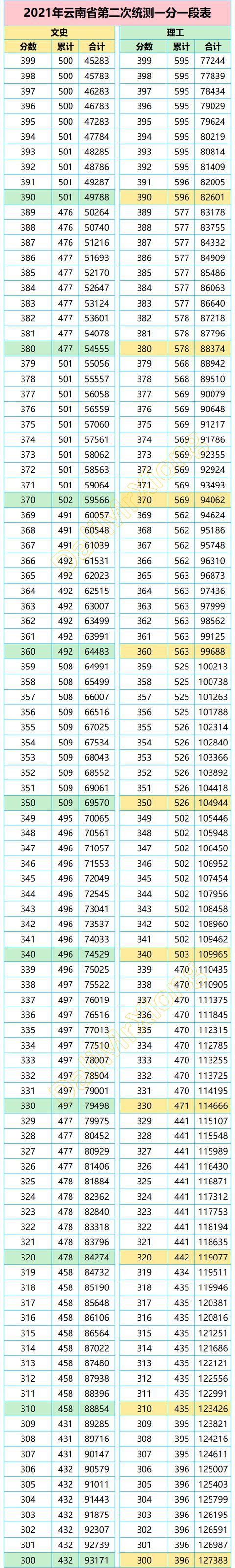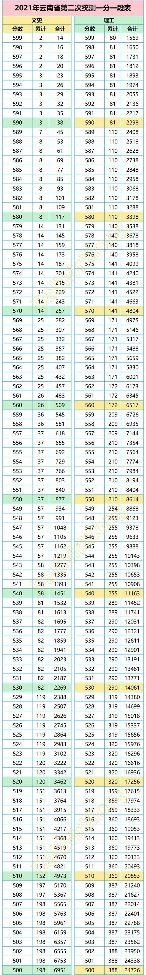以下是根据2021年云南第二次统测十分一段表推算出一分一段表,仅供参考: