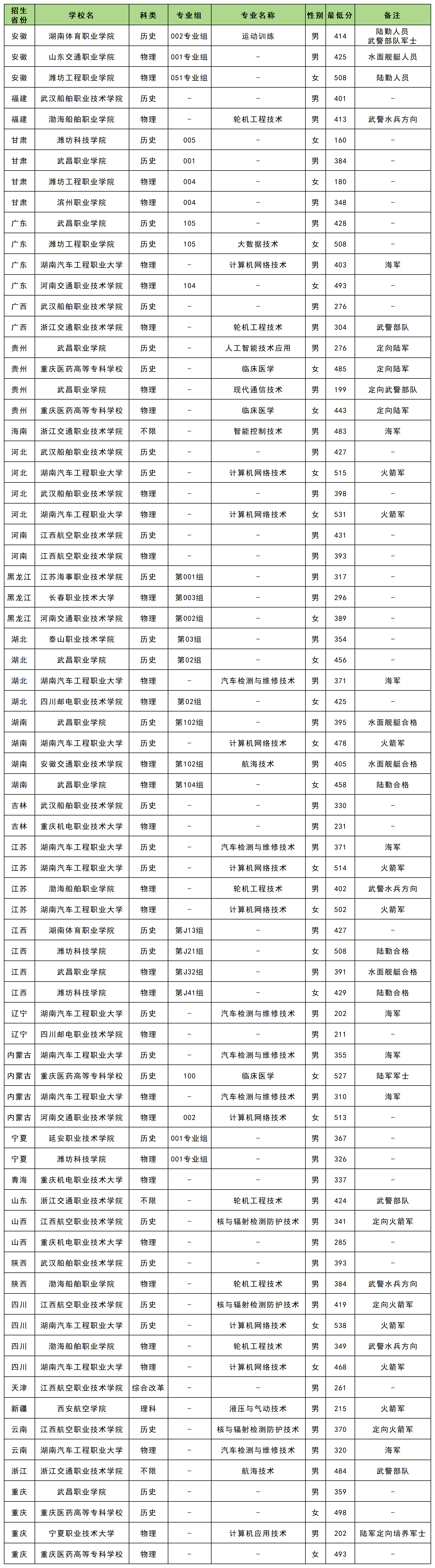 从上文整理的全国定向培养军士院校最低录取分数线表,老师发现部分省份录取分数线最低的定向培养军士院校都是湖南汽车工程职业大学或武昌职业学院,因此下面为大家整理了这两所大学在全国各省录取分数线情况。