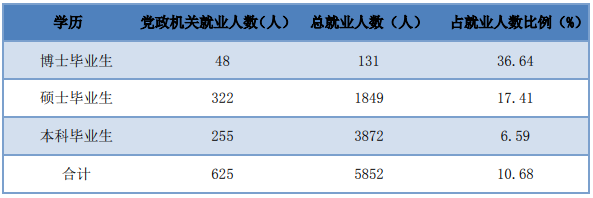 党政机关:已就业毕业生中有 10.68%到党政机关工作。