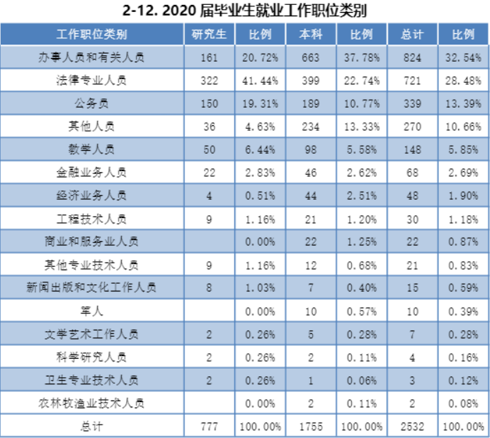 已经落实就业单位的毕业生中,硕士生的工作职位以法律专业人员(41.44%)、办事人员和有关人员(20.72%)、公务员(19.31%)为主;本科生的工作职位以办事人员和有关人员(37.78%)、法律专业人员(28.48%)、公务员(10.77%)为主。