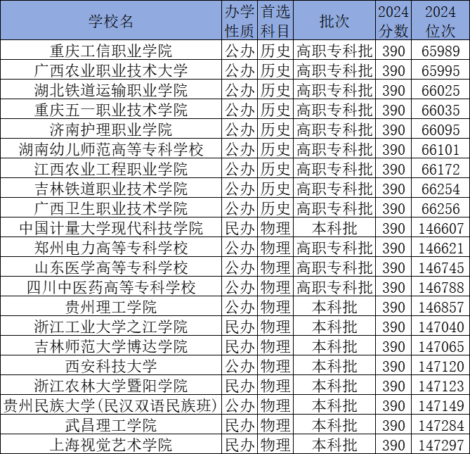 历史类390分能上的有重庆工信职业学院、广西农业职业技术大学、湖北铁道运输职业学院、重庆五一职业技术学院、济南护理职业学院等;物理类390分能上的有中国计量大学现代科技学院、郑州电力高等专科学校、山东医学高等专科学校、四川中医药高等专科学校、贵州理工学院等。