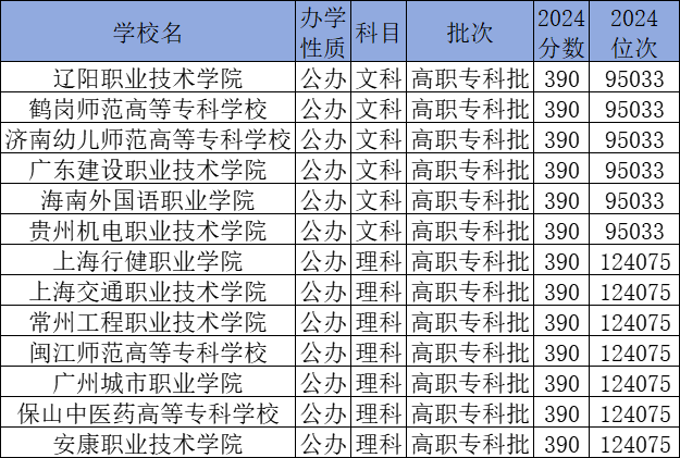 文科390分能上的大学有辽阳职业技术学院、鹤岗师范高等专科学校、济南幼儿师范高等专科学校、广东建设职业技术学院等;理科390分能上的大学有上海行健职业学院、上海交通职业技术学院、常州工程职业技术学院等。