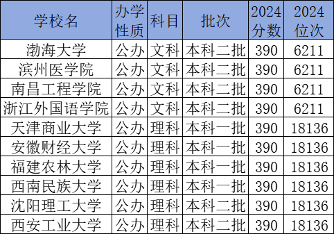 文科390分能上的大学有渤海大学、滨州医学院、南昌工程学院、浙江外国语学院;理科390分能上的大学有天津商业大学、安徽财经大学、福建农林大学、西南民族大学等。