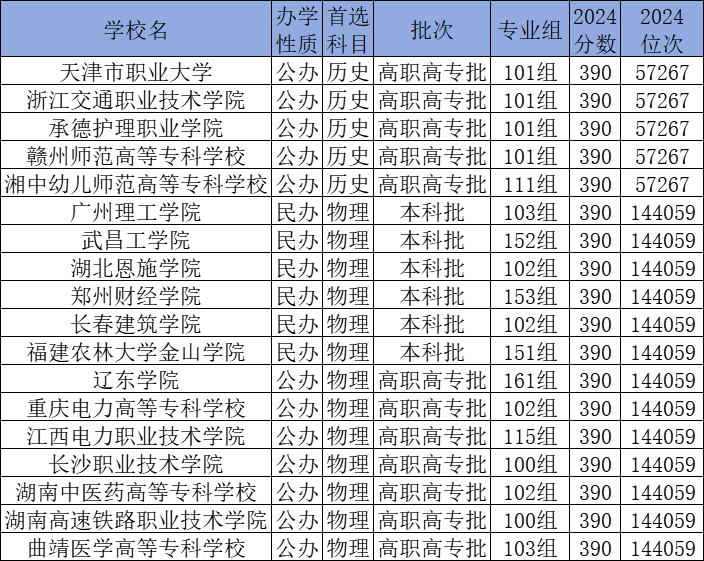 历史类390分能上的有天津市职业大学、浙江交通职业技术学院、承德护理职业学院等;物理类390分能上的有广州理工学院、湖北恩施学院、武昌工学院、郑州财经学院等。