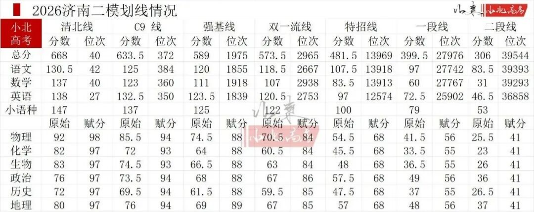 山东省各地市高三二模考试已于4月全面展开。2026济南二模清北线668分、双一流线573.5分、特招线481.5分、一段线399.5分、二段线306分。
