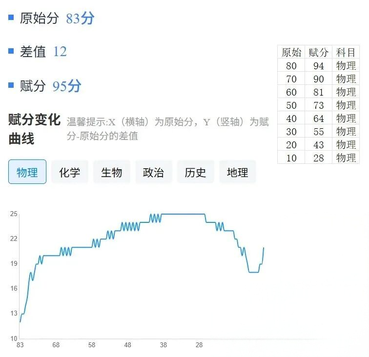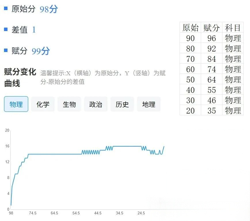 物理:原始分80分能赋92分、60分能赋74分、40分能赋55分;