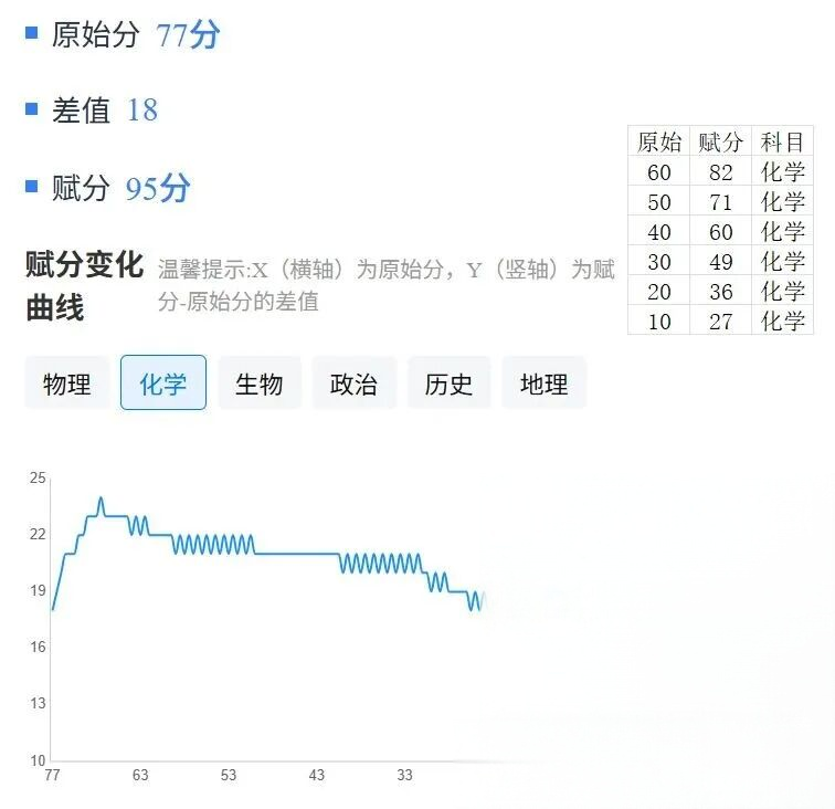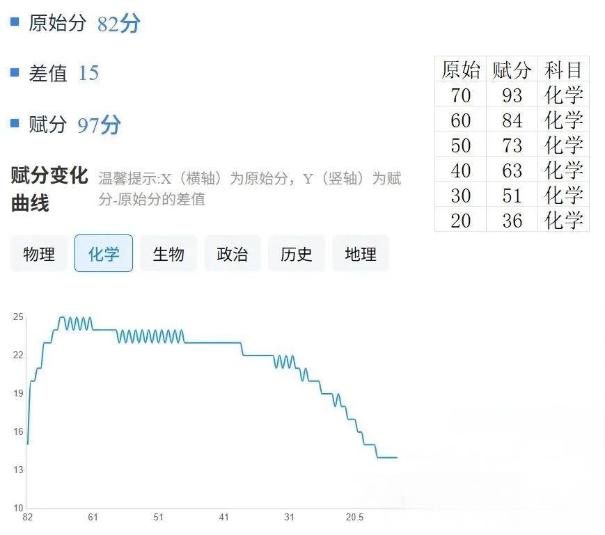 化学:原始分60分能赋82分、50分能赋71分、20分能赋36分;