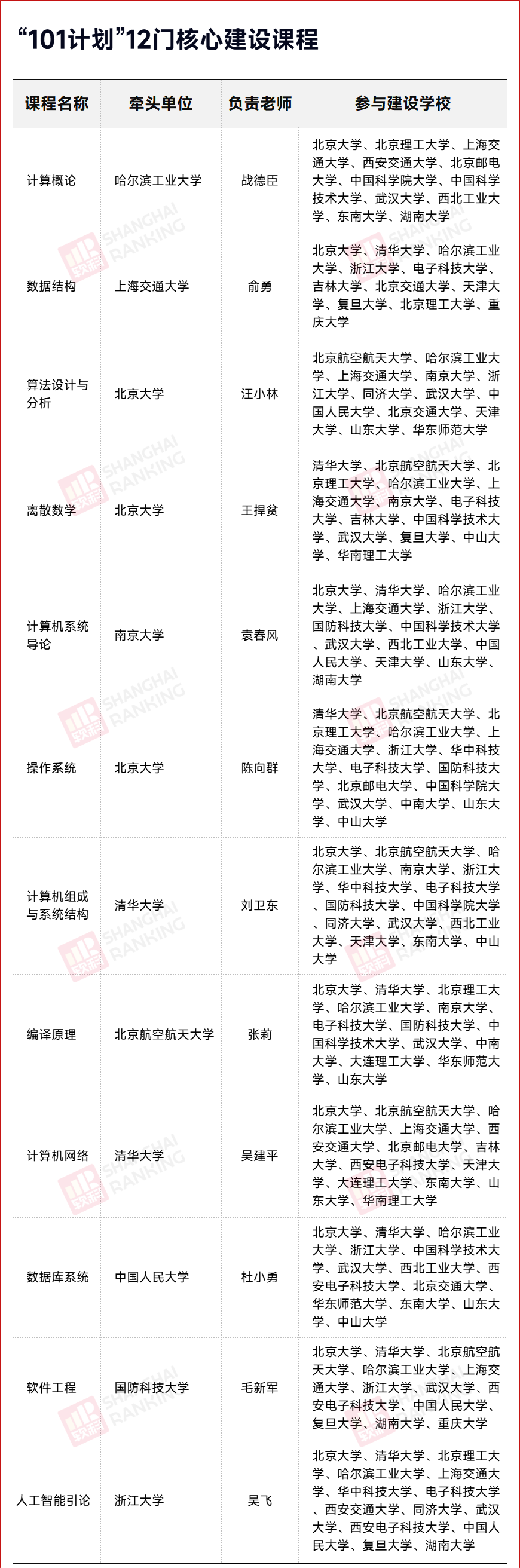 101计划中12门核心课程分别有计算概论、数据结构、算法设计与分析、离散数学、计算机系统导论、操作系统、计算机组成与系统结构、编译原理、计算机网络、数据库系统、软件工程、人工智能引论。