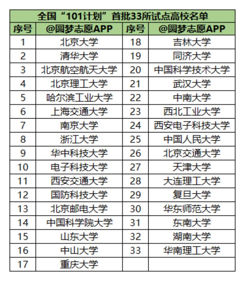 入选首批101计划33所高校名单:北京大学、清华大学、北京航空航天大学、北京理工大学、哈尔滨工业大学、上海交通大学、南京大学、浙江大学、华中科技大学、电子科技大学、西安交通大学、国防科技大学、北京邮电大学、中国科学院大学、吉林大学、同济大学、中国科学技术大学等院校;