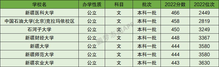 文科收分最低的是新疆农业大学,其2022年最低分为443分(超新疆文科一本线0分),录取位次为3630位。
