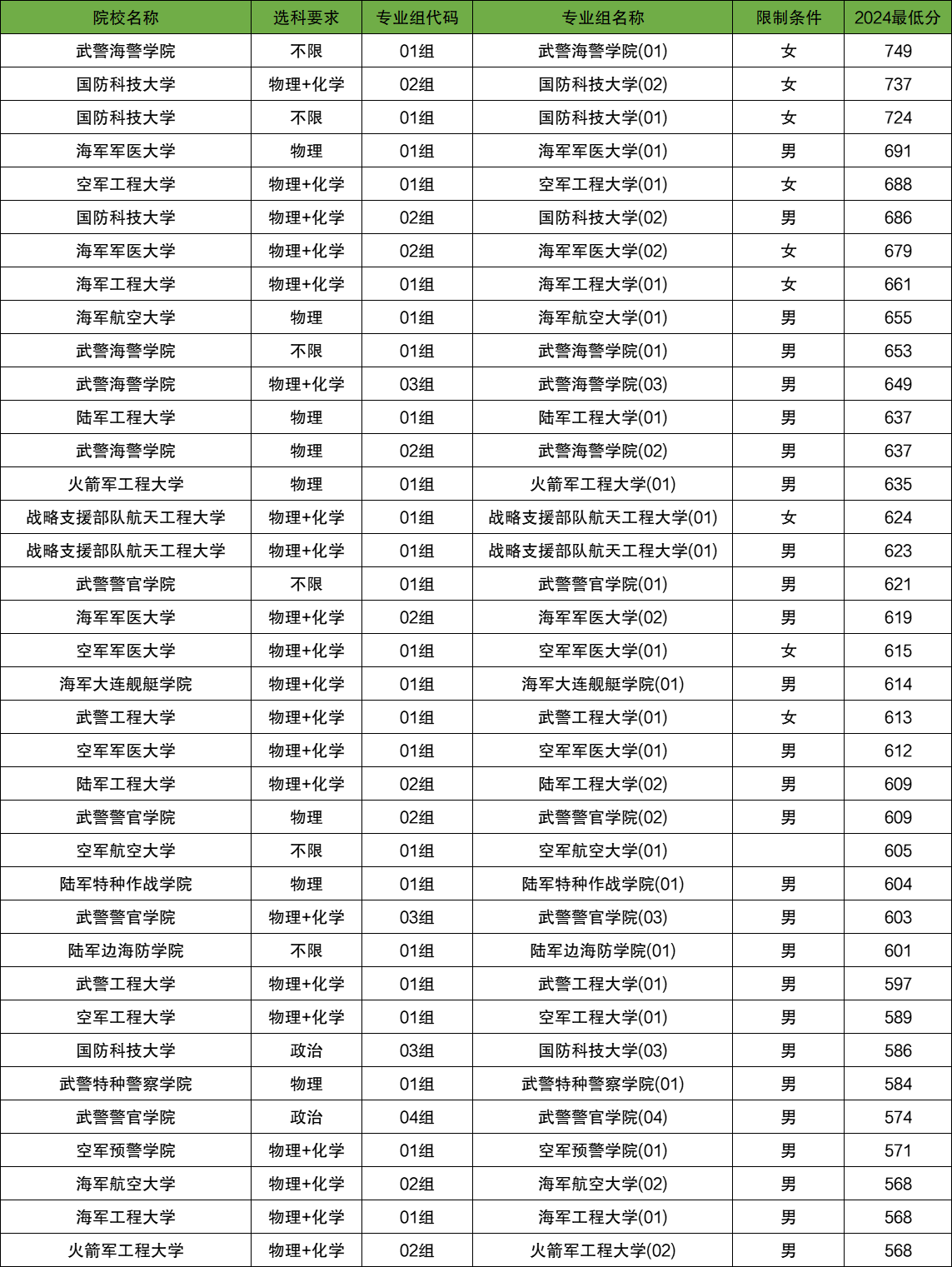 其他大学还有空军工程大学、海军军医大学、陆军特种作战学院等大学,以下2024年全国军校在海南省的招生大学及分数线。