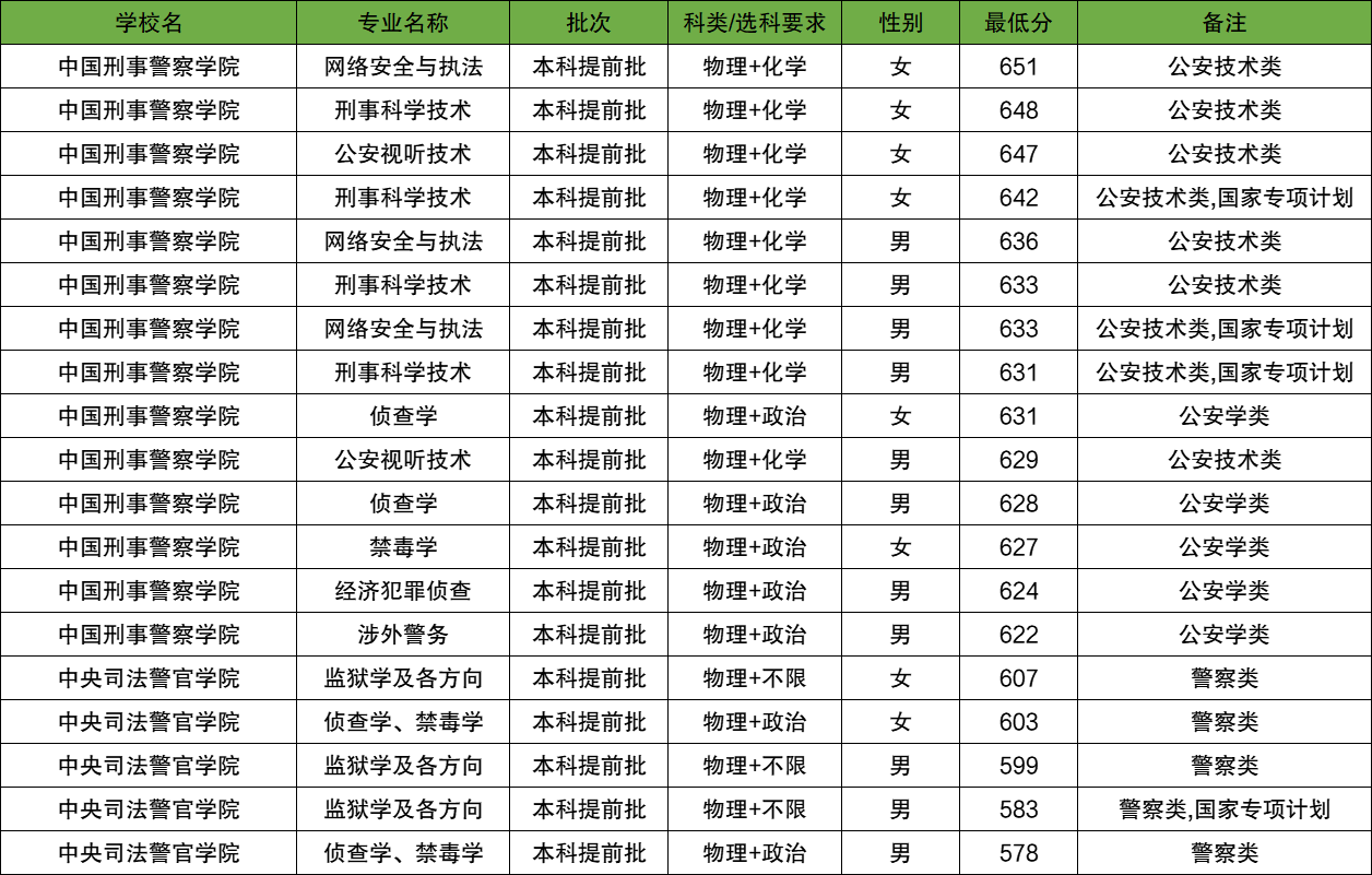 最低录取分数线为:男生578分、女生603分,招生院校是中央司法警官学院。