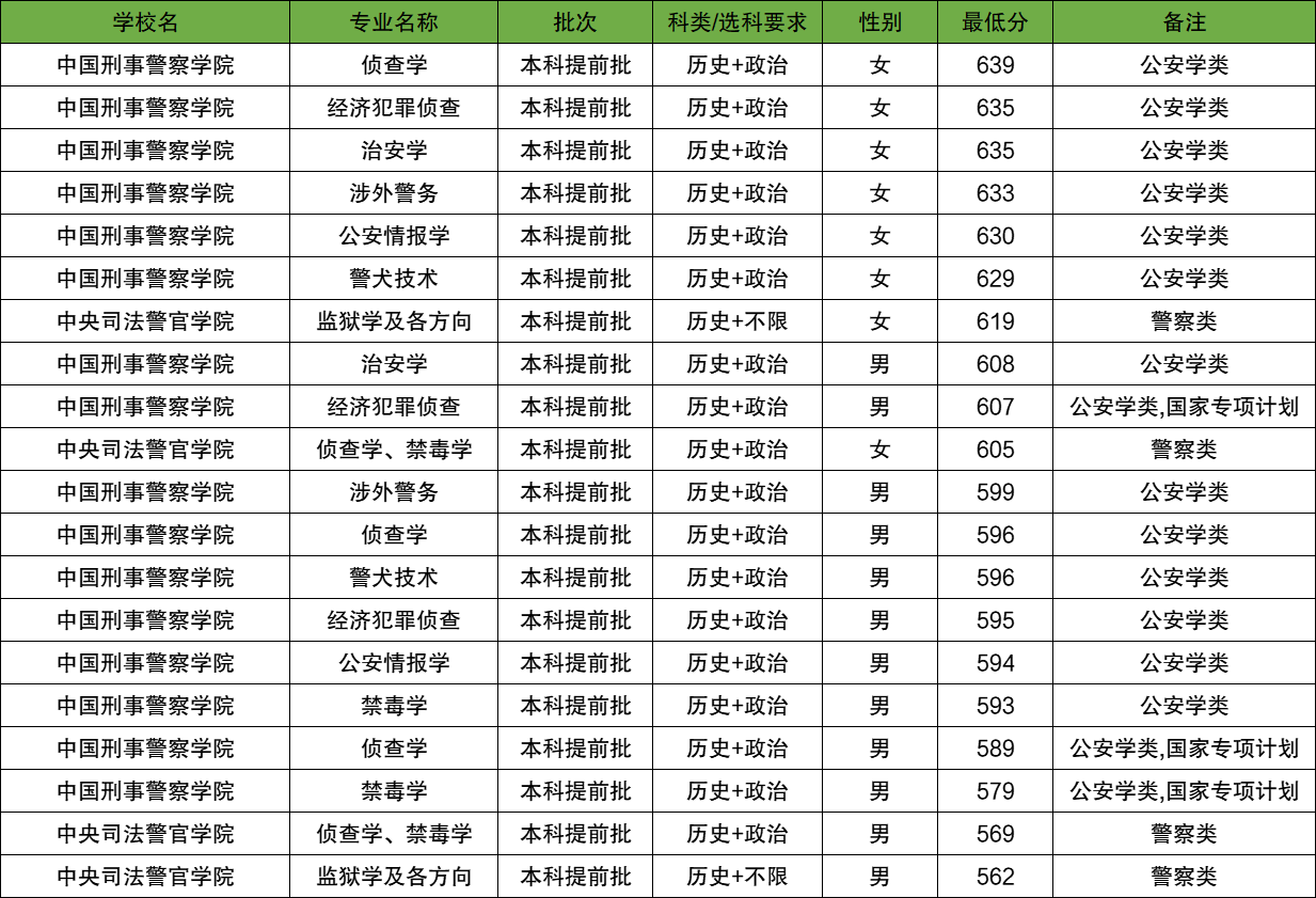 最低录取分数线为:男生562分、女生605分,招生院校是中央司法警官学院。