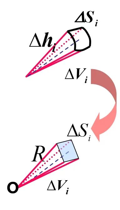 2)若每小块表面看作一个平面,将每小块平面作为底面,球心作为顶点便得到n个棱锥,这些棱锥体积之和近似为球的体积。当n