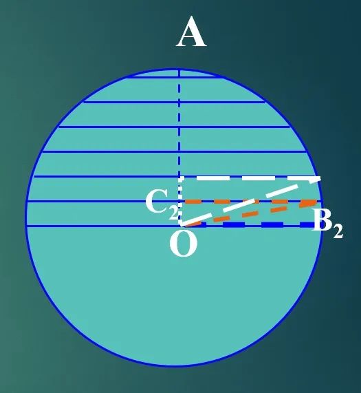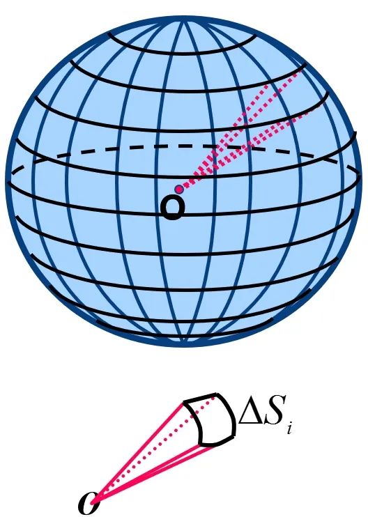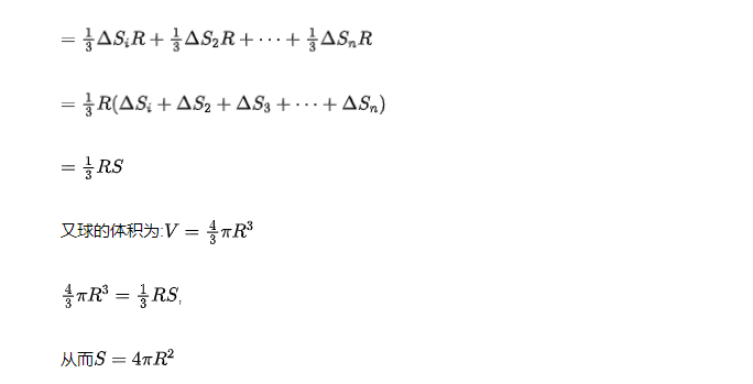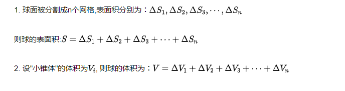 1)球的表面是曲面,不是平面,但如果将表面平均分割成n个小块,每小块表面可近似看作一个平面,这n小块平面面积之和可近似看作球的表面积。当n