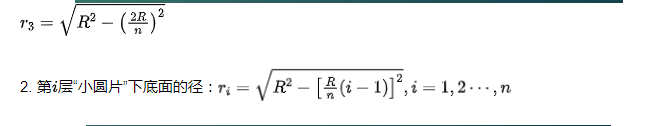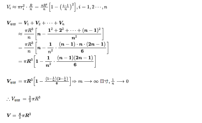 1.即先把半球分割成 、n 部分,再求出每一部分的近似体积,并将这些近似值相加,得出半球的近似体积,最后考虑 n 变为无穷大的情形,由半球的近似体积推出准确体积。