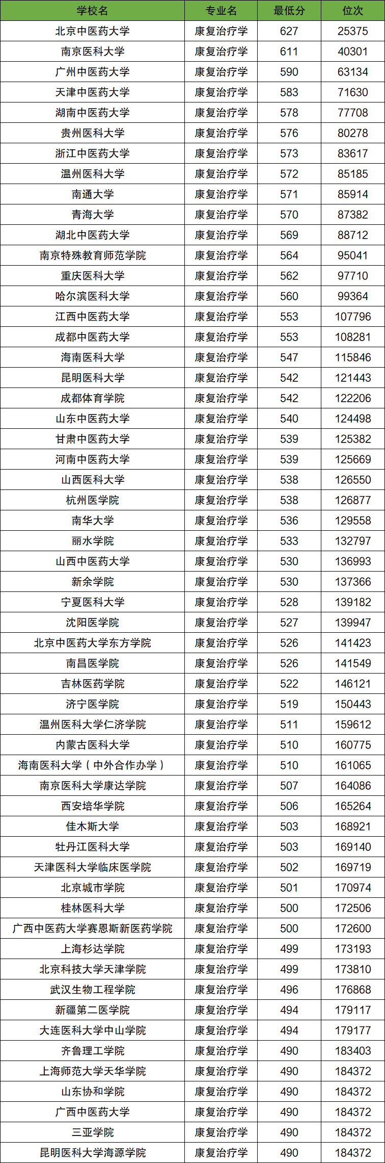 1.康复治疗学专业录取分数线
