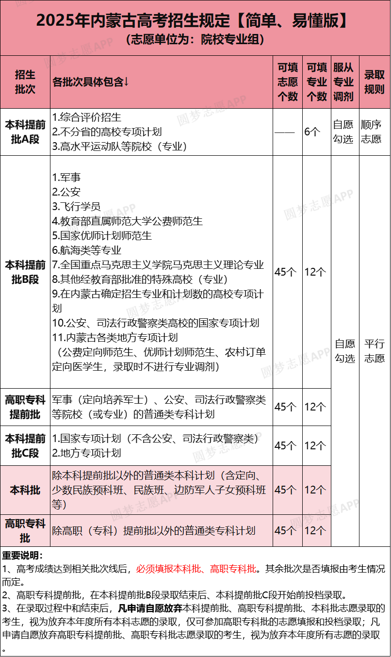 内蒙古新高考志愿模式为“院校专业组”,本科批和专科批均设置45个平行志愿,每个院校专业组内可选6个专业。