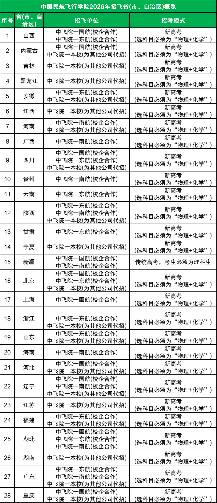 中国民用航空飞行学院2026年本科招生简章最新出炉:飞行技术专业面向北京、河北、山西、陕西、浙江、福建、安徽等28个地区招生,要求必选物理+化学、性别为男性且年龄在16-20周岁之间,属于校企合作招飞,在本科提前批次录取。
