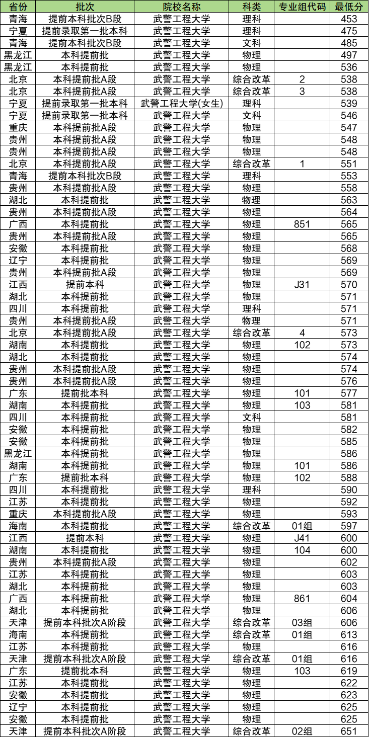 武警工程大学只在本科提前批招生,在各省的录取分数线为:453分-651分。