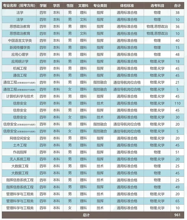 2025年招生计划还未公布,大家可以参考2024年的招生计划进行志愿规划。2024年武警工程大学共计划招收961人,招生专业包括:法学、机械工程、信息安全、通信工程等。