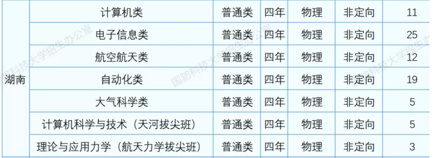 国防科大招收物理类考生的专业有计算机类、电子信息类、航空航天类、自动化类、大气科学类、计算机科学与技术 (天河拔尖班)、理论与应用力学 (航天力学拔尖班)等。