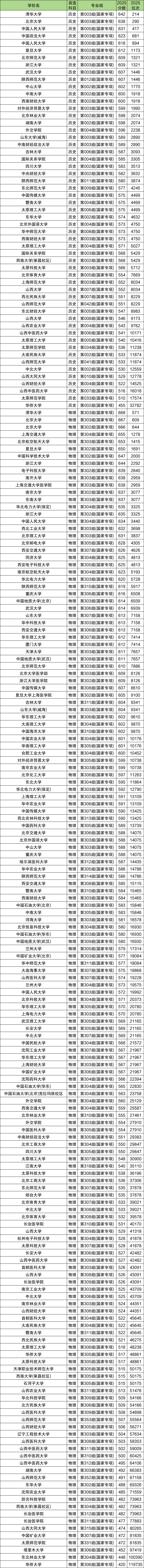 2025年在山西具有国家专项计划招生的院校一共有124所,其中在历史类中录取分最高的是清华大学第003组,最低分642分;录取分最低的是华侨大学第002组,最低分455分,大部分学校最低分数线都在520分以上。