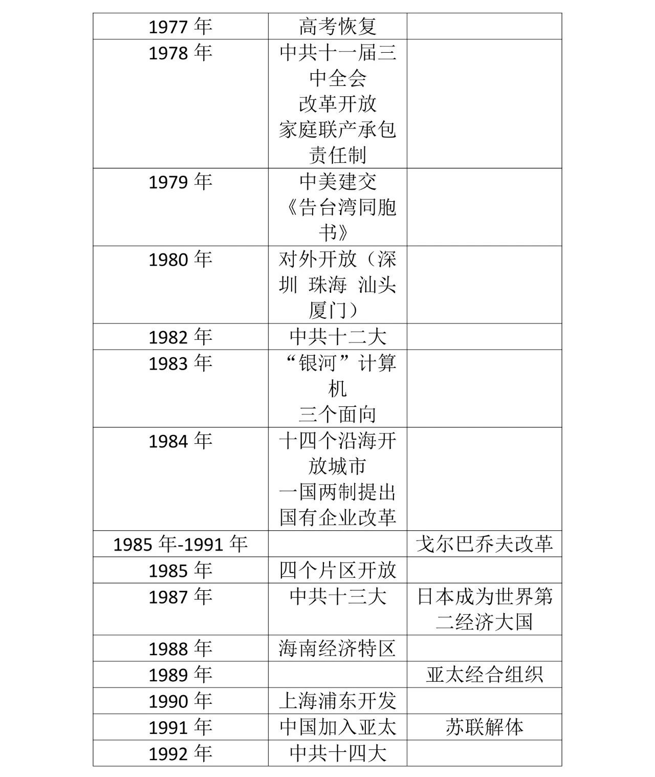 60.中共十一届三中全会(1978)内容:①抛弃了“以阶级斗争为纲”的“左”倾错误方针,重新确立了解放思想、 实事求是的马克思主义思想路线;②作出把党的工作重心转移到社会主义现代化建设上来的战略决策,实行改革开 放的伟大决策。历史意义:①是建国以来党的历史的一次伟大转折,也是共和国历史的一次伟大转折;②成为我国开辟中国特 色社会主义道路的起点,开创中国社会主义现代化建设新时期的伟大起点。