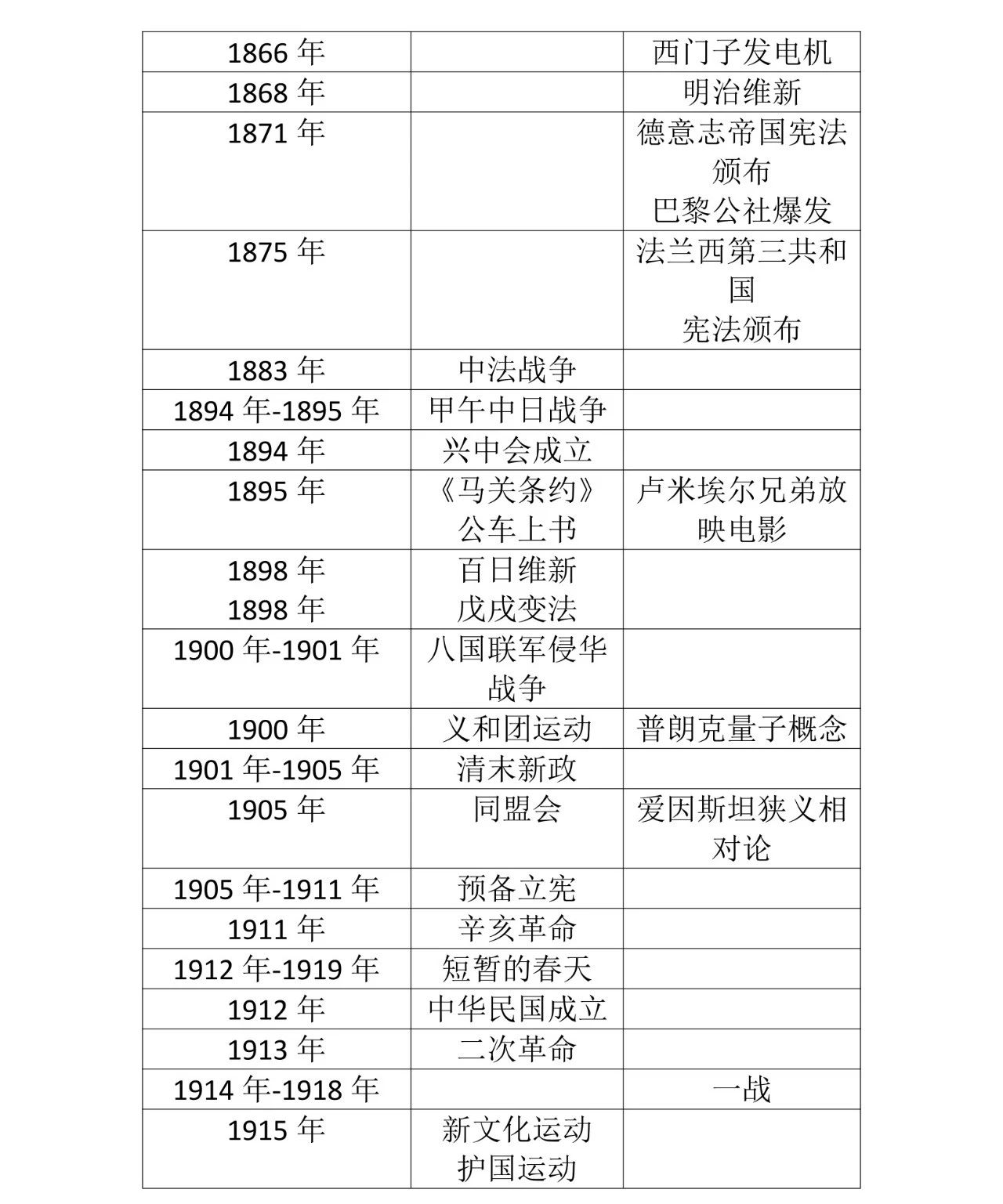 15.辛亥革命:1905 年,中国同盟会在日本东京成立,中国同盟会是第一个全国性的统一的资产阶级革命政党。以驱除鞑虏,恢复中华,创立民国,平均地权为政治纲领,并将其阐发为“民族、民权、民生”的三民主义。1911 年 10 月 10 日,辛亥革命武昌起义首役成功。1912 年元旦,孙中山在南京宣誓就任临时大总统,宣告中华民国成立。同年春,孙中山领导的临时政府颁布了《中华民国临时约法》,成为了中国历史上第一部资产阶级宪法,具有反对封建专制制度的进步意义。意义:是中国近代史上一次伟大的资产阶级革命,它推翻了清王朝,结束了中国两千多年的封建君主 专制制度,建立起资产阶级共和国,使民主共和观念深入人心,沉重打击了帝国主义侵略势力。局限性:辛亥革命没有完成反帝反封建的任务,证明资产阶级共和国方案在中国行不通。