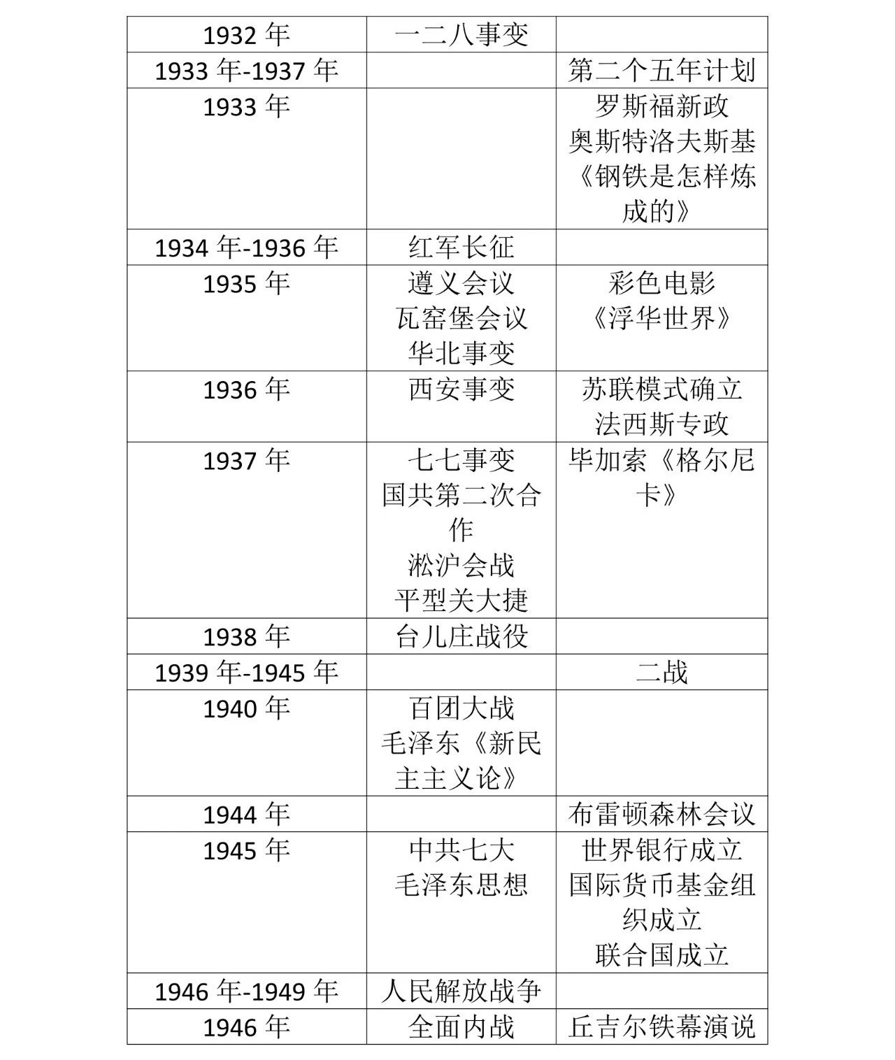 13.抗日战争:面对日军侵华,国共两党停止内战,组成抗日民族统一战线,奋起抗战。淞沪会战粉碎了日军三个月灭亡中国的企图。抗战前期,中国军队取得了平型关战役(太原会战)、台儿庄战役(徐州会战)的胜利。1940 年,彭德怀指挥八路军发动百团大战,这是中国军队主动出击日军的一次大规模战役。历史地位:①是中国人民一百多年来第一次取得反帝斗争的完全胜利;②大大增强了全国人民的民 族自尊心和自信心;③对世界反法西斯战争的胜利作出了重大贡献;④中国的国际地位得到提高。