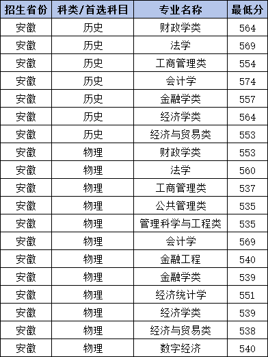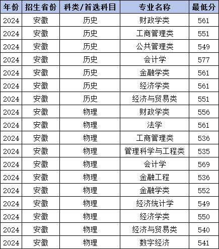 2024年安徽财经大学地方专项计划在安徽录取最低分历史类为553分、物理类为535分,历史组收分最低的专业为经济与贸易类、物理组收分最低的专业为公共管理类和管理科学与工程类。