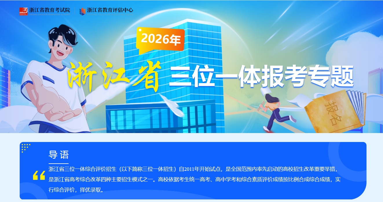三位一体招生报考期间,浙江省教育考试院网站会专设2026年浙江省三位一体报考专题,发布政策资讯解读,汇集各高校招生章程。考生可通过试点高校招生官网或以上专题网页了解报考信息。