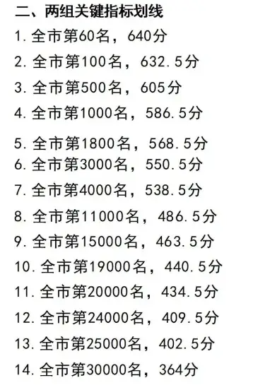 2024年青岛二模全市第60名,对应分数为640分;全市第100名,对应分数为632.5分;全市第500名,对应分数为605分;全市第1000名,对应分数为586.5分;更多成绩排名对应分数详见下图: