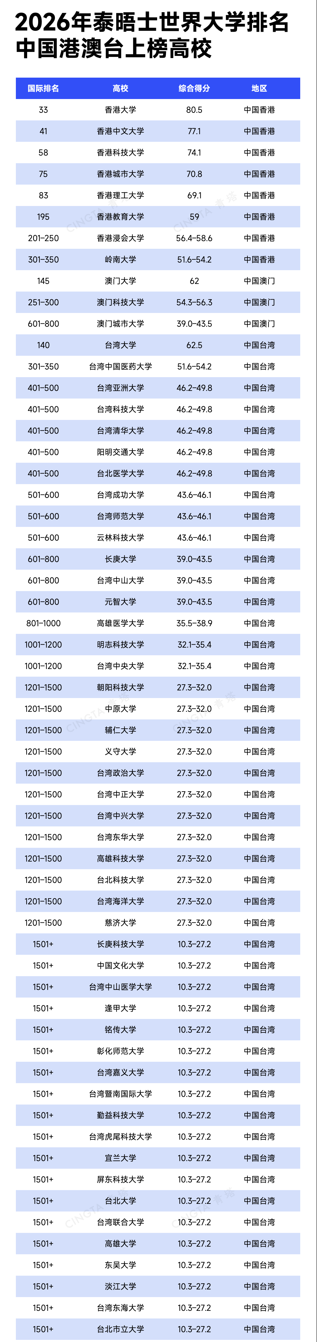 2026年泰晤士世界大学排名中国港澳台上榜高校共计58所,其中中国香港排名最好的大学是香港大学(世界第33名),中国澳门排名最好的大学是澳门大学(世界第145名),中国台湾排名最好的大学是台湾大学(世界第140名)。