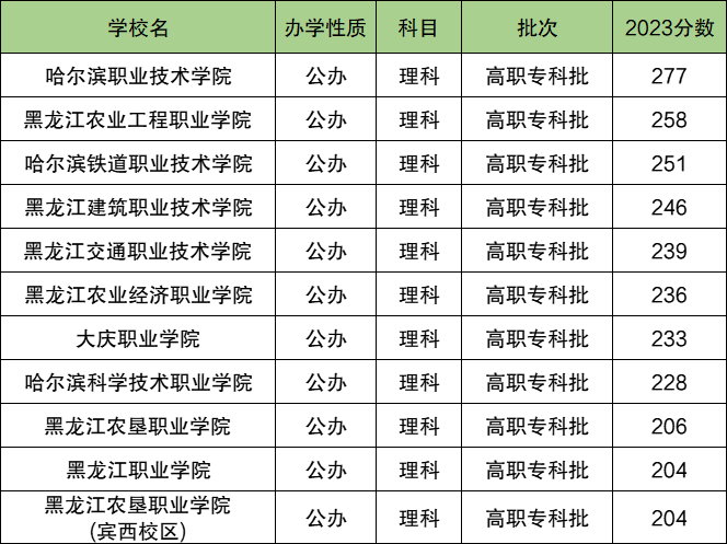 2023年黑龙江十大专科院校理科招生分数线范围在204分~277分之间,理科生至少要超专科线(160分)44分以上才能报考。