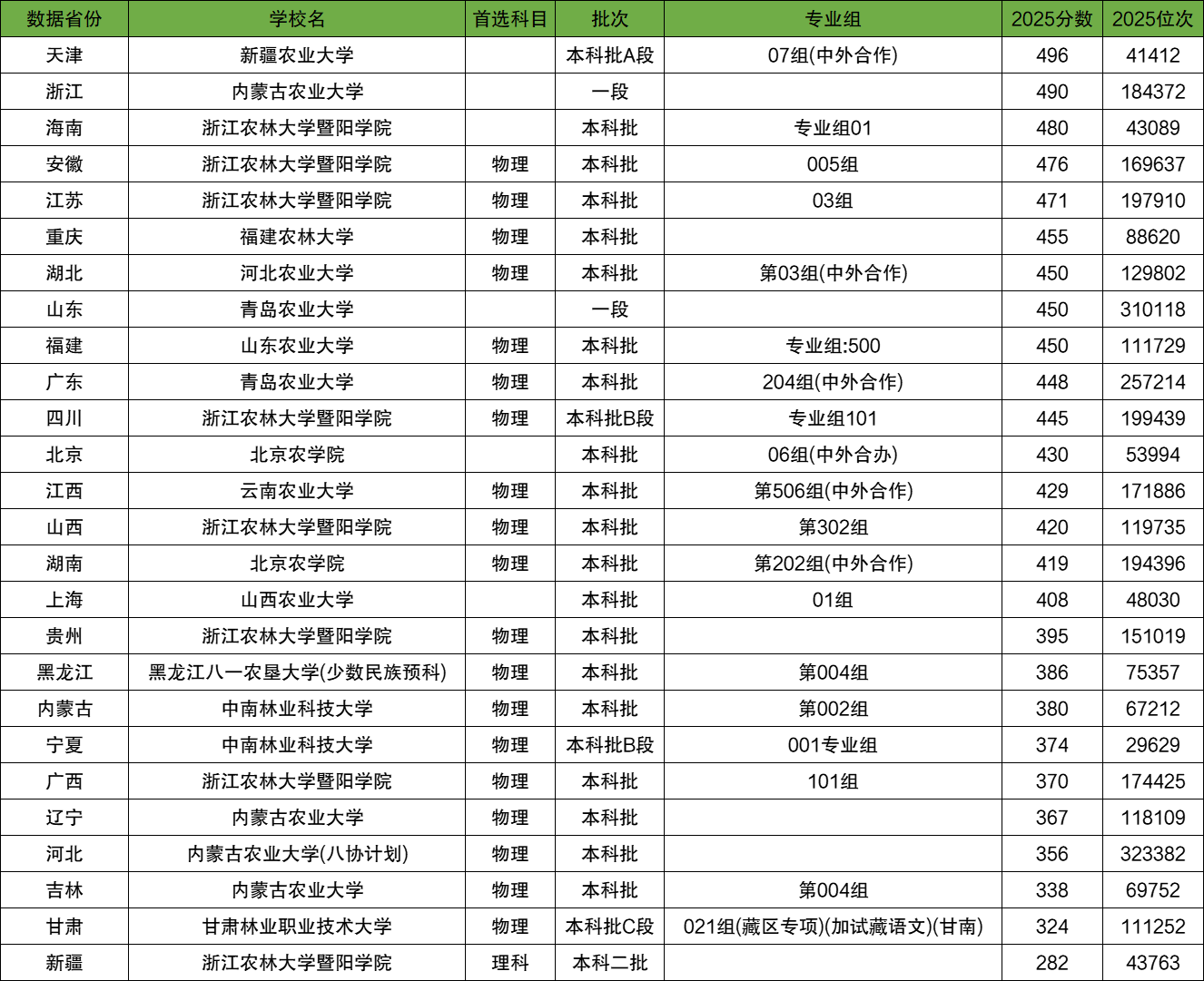 2025年全国理科/物理类分数最低的农业大学分数范围在282分~496分之间,其中新疆考生上农业大学的分数门槛最低,2025年新疆理科生282分即可报考浙江农林大学暨阳学院,而该分数对应在省排名位次为43763。