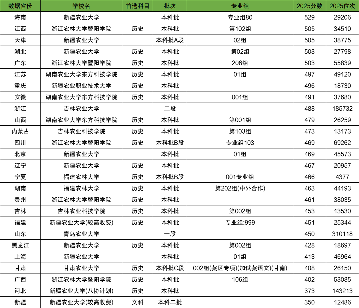 下面是文科/历史类2025年全国各省分数最低的农业大学名单,其中3+3省份仅统计选科要求包含政、地、历(组合不含物理)以及不限选科的最低分大学分数。
