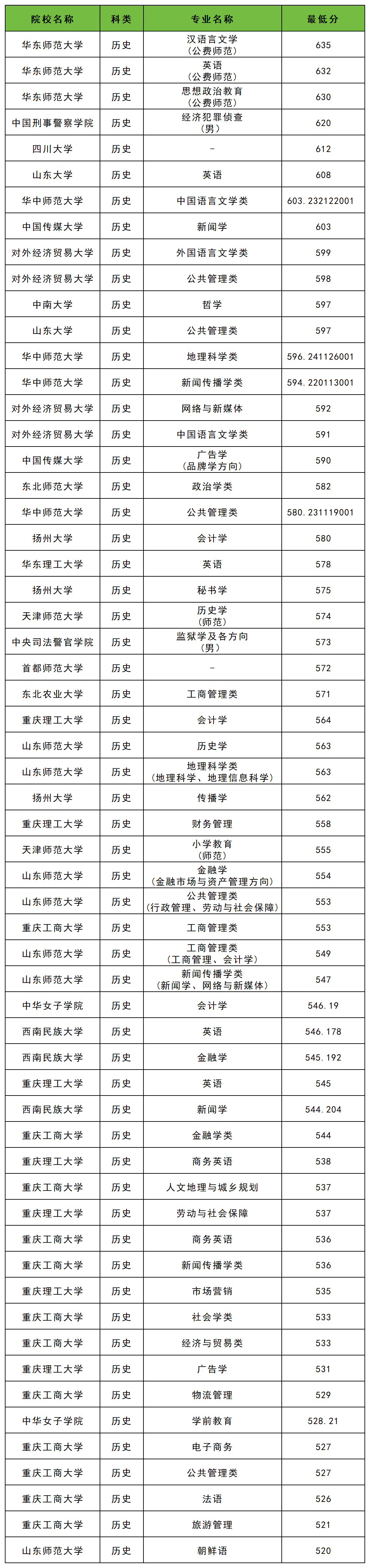2025年重庆国家专项历史类录取分数线位于520分到635分之间,各学校各专业最低分如下。