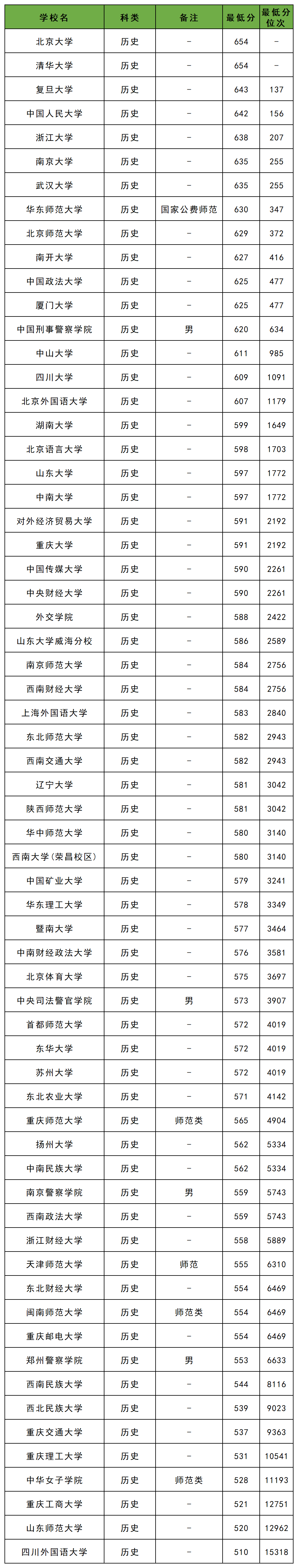 2025年重庆国家专项历史类录取分数线位于510分到654分之间,各学校最低分如下。