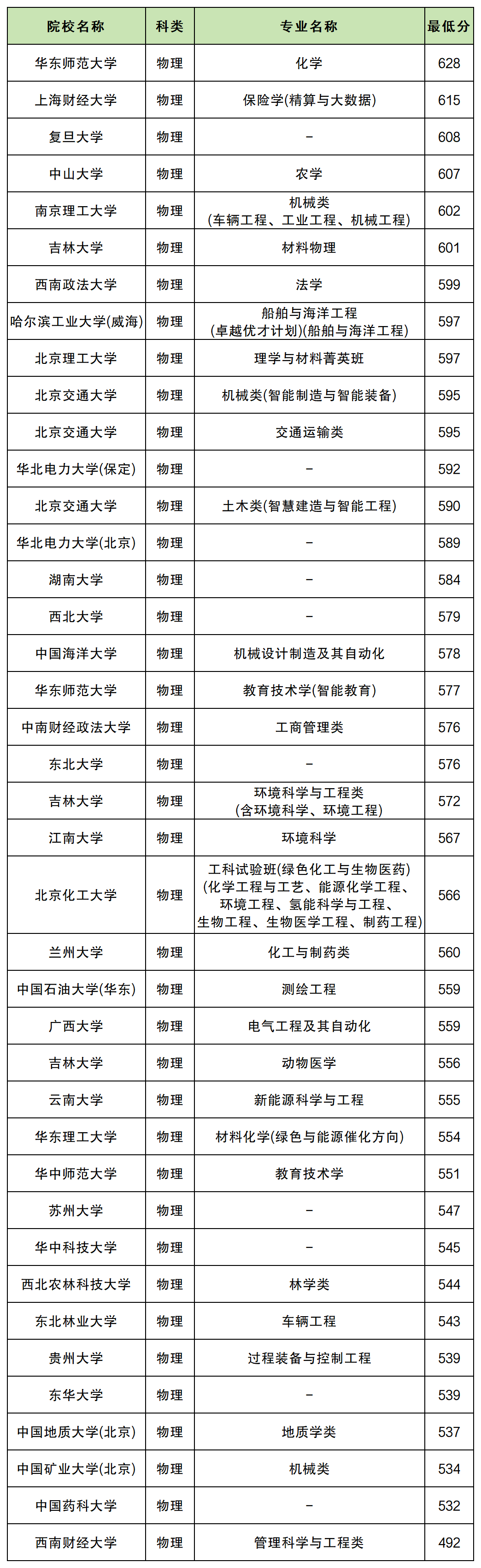 2024年各大学高校专项计划在吉林物理类的招生专业要多于历史类,物理类各大学高校专项计划各专业的录取分数线在492分-628分之间;录取分数最高的是华东师范大学化学,最低分为628分;录取分数最低的是西南财经大学管理科学与工程类专业,2024最低分为492分。