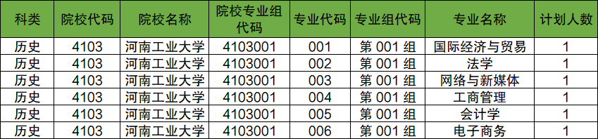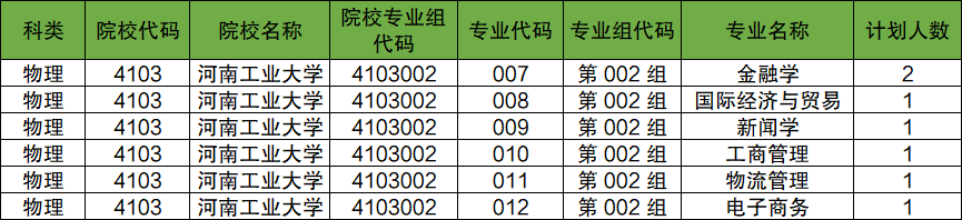 第002组:专业组代码为4103002,包含专业有金融学、国际经济与贸易、新闻学、工商管理、物流管理、电子商务,招生人数分别为3、3、2人。