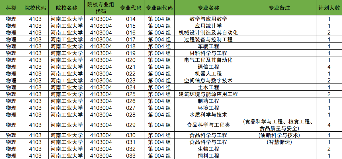 第004组:专业组代码为4103004,包含专业有数学与应用数学、应用统计学、机械设计制造及其自动化、过程装备与控制工程、车辆工程、材料科学与工程、电气工程及其自动化、通信工程、机器人工程、空间信息与数字技术、土木工程、建筑环境与能源应用工程、制药工程、环境工程、水质科学与技术、食品科学与工程类、食品科学与工程、食品科学与工程、生物工程、饲料工程。