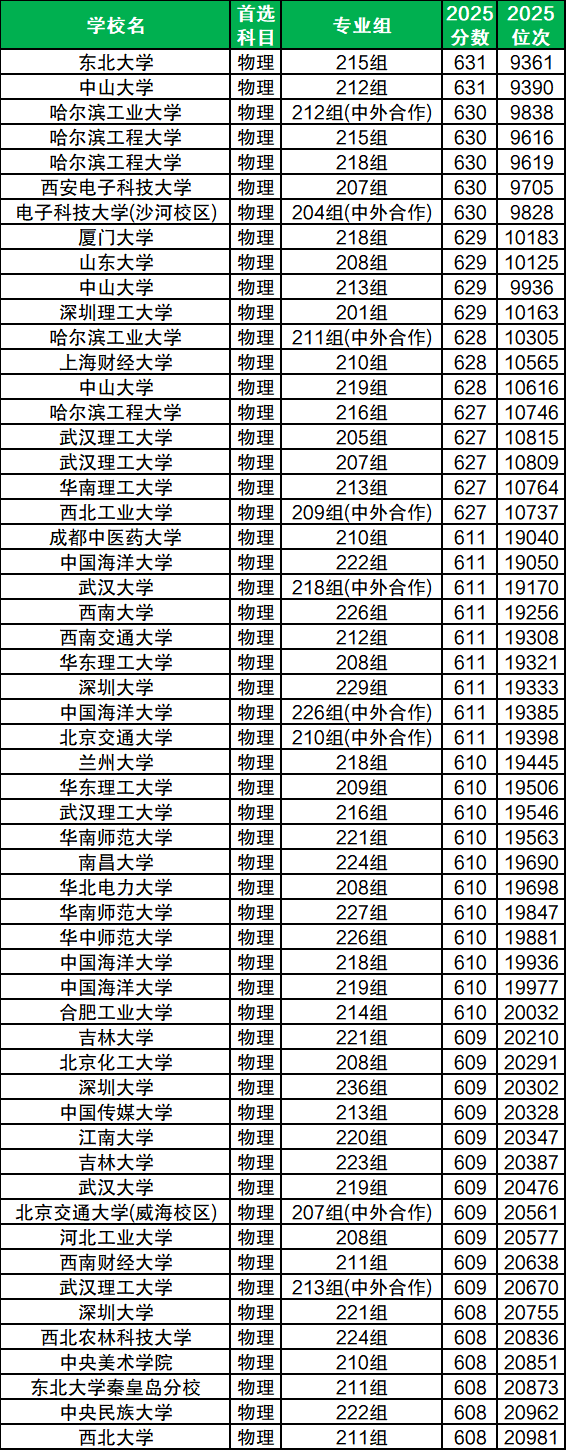 不同大学2025年在广东招生录取位次不同,下面以物理类为例,展示广东高考位次对应大学名单: