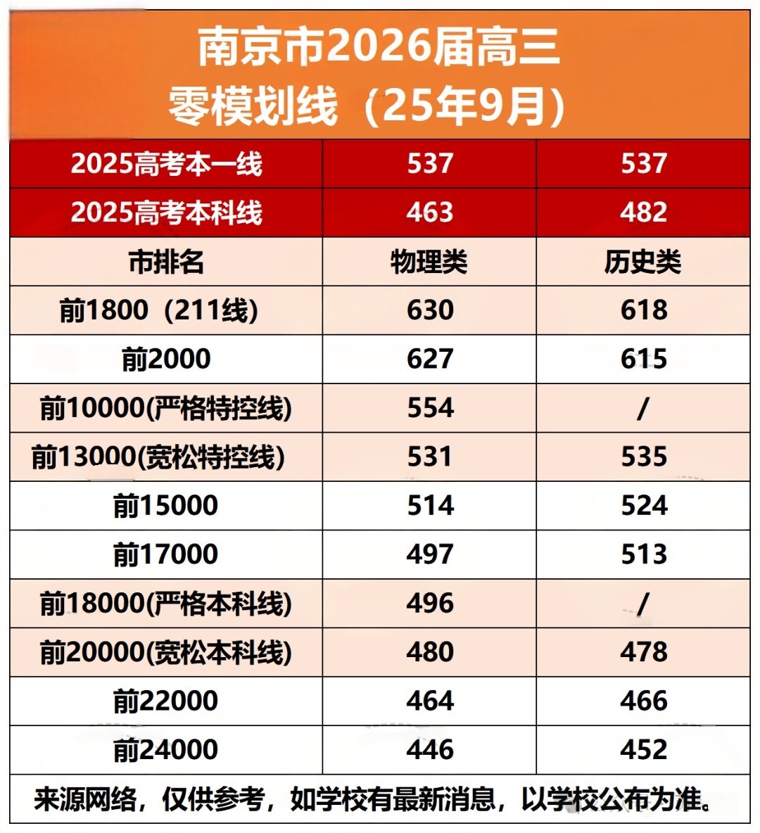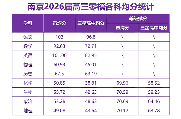 2026届南京高三零模考试于9月18日-19日进行,目前均分、分数线、成绩排名表部分已公布,详情如下: