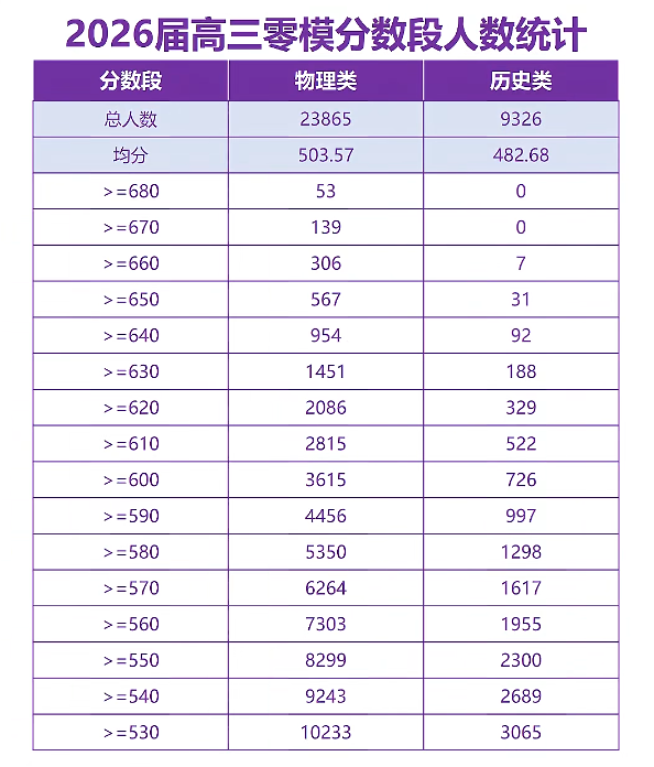 按照“十分一段表”统计,参考人数中物理类总人数23865人、历史类总人数9326人,下面是2026届南京高三零模成绩排名表,表格信息解读: